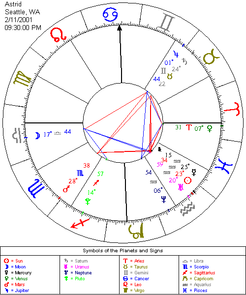 Name: Astrid February 11 2001 9:30 PM Time Zone is 8 Hrs. Includes daylight time if applicable. Seattle, WA Rising Sign is in 09 Degrees Libra Very attractive and popular, your charm helps you to get your own way and prevents others from getting angry with you. "Peace and harmony at all costs" is your battle cry. You always try to ameliorate or to cosmetically hide any physical ugliness or any angry feelings between people. Flashy, but not gaudy, you prefer to dress elegantly. You generally have good taste in music, art and literature. Beware of the tendency to compromise yourself in your attempt to be agreeable at all times. A bit of a social butterfly, at times you can be vain and lazy. For the most part, however, you are gracious and affectionate, and your refined and aristocratic demeanor serves as a role model to others. Sun is in 23 Degrees Aquarius You get bored with the status quo and are generally open to new things and ideas. An individualist and a free spirit, your friends are quite important to you as long as they do not try to tie you down by making too many emotional demands on you. Your thoughts are offbeat and you're a bit eccentric, but not always very changeable. As a matter of fact, you can be quite stubborn at times. Very fair-minded when dealing with large groups or broad issues, you are not always emotionally sensitive to the needs of individuals. Extremely objective, with good powers of observation, you would be qualified to study technical and complicated subjects, like science, computers or maybe even astrology. Moon is in 17 Degrees Libra Affectionate, warm and friendly, life must be a "beautiful" experience for you. Unpleasantness should be avoided at all costs. You tend to overlook other people's faults and you would rather give in than fight. You are uncomfortable with strangers, but at ease and sociable with friends and associates. Indeed, you would rather socialize than work -- you can use your prodigious charm to avoid unpleasant tasks. You need the support and assistance of another in order to get you started on any new project -- you are not a self-starter. Be careful of a tendency to be overly self-indulgent (i.e., lazy). Your refined aesthetic sensibilities attract you to music, dance, art and any other cultured activity. Mercury is in 25 Degrees Aquarius You tend to be very opinionated -- you have strongly felt notions about things and are quite vocal about expressing and defending them. Yet you are also an original thinker -- you enjoy shocking others with your offbeat, original thoughts. You appreciate and need mental and intellectual stimulation. Your judgment is usually fair and impartial -- you can be a good critic because you can remain objective and unemotional about most things. Venus is in 07 Degrees Aries You are a very affectionate person but you hate to be tied down. You are more than willing to be the aggressor in initiating new relationships. Indeed, once you have set your sights on someone, you tend to pursue him or her ardently and passionately. But you do demand your own way in a relationship. Try to give in to your partner's needs and desires once in a while. Mars is in 28 Degrees Scorpio Your likes and dislikes are strong and intense, never casual or superficial. You are known for your persistence and willful obsession. Once you have decided on a course of action, you are unstoppable. Your emotional actions tend to be extreme, although you try to keep them muted. You are not quick to anger, you do slow burns. And you tend to release your anger as sarcasm or irony. Beware of your tendency to hold grudges and to be vengeful. When you do fight, or release your internal tensions, you do so body and soul -- you become totally passionate and your outbursts are awesome to behold. Jupiter is in 01 Degrees Gemini You have a logical, detached, objective view of most things. Your interests are wide-ranging and you are an avid student, with expertise in many different areas. You love to work things out in your mind -- everything you do is reduced to an exercise in logic and reason. You have the ability to grasp abstractions and to deal successfully with the larger issues of life. Your overemphasis on developing your powerful intellect can cause your emotional and intuitive abilities to atrophy unless you consciously choose to exercise them. Saturn is in 24 Degrees Taurus Complete freedom of choice makes you ill at ease. You must have a firm, ordered, secure foundation in your life in order to feel comfortable. You do not adapt easily and tend to fear the new and untried. You constantly fear that you do not have enough (love, property, material things, etc.) and this makes you tend toward being selfish, withdrawn and stingy. If you try to surround yourself with supportive people in your environment, you will become more emotionally self-supporting. Uranus is in 20 Degrees Aquarius You, and most of your peer group as well, are reformers at heart. You want to make positive changes that will benefit society as a whole. You are willing to devote your time and energy to see that they come about, especially if the proper group support and combined purpose of will can be found. Be careful that your devotion to group goals does not produce too much friction or neglect in your own interpersonal one-on-one relationships. Neptune is in 06 Degrees Aquarius You, and your entire generation, will idealize and even venerate the ability to remain detached as well as the ability to objectively analyze any given situation. There will be a concerted effort on your part to cure the ills of society as a whole. But be very careful to continue to maintain and protect the rights of individuals in the midst of these potentially far-reaching changes. Pluto is in 14 Degrees Sagittarius For your entire generation, society's cherished beliefs and totems will be radically changed. Many traditional concepts will be totally altered, if not completely destroyed. The rights of in